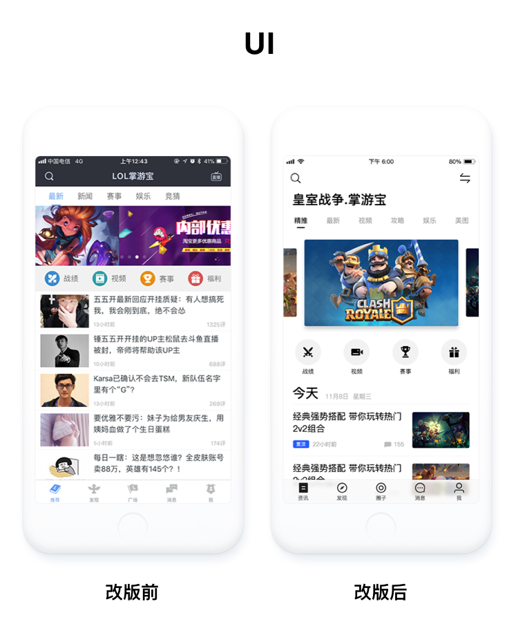 资讯是用户快速了解游戏资讯内容的核心页面,也是掌游宝首页,之前的页面会根据不同游戏定制不同的界面风格,新版我们统一了风格,采用黑白的配色方案,保持更好的通用性同时有效的降低开发成本。页面模块间增加了留白,减少了色块的分隔,采用更大更醒目的标题,反复调整字号、字重,字间距及行间距,将资讯内容按日期维度划分,信息流本身也做了更多的排版变化,而不是简单的左右结构,目的是让用户在浏览阅读过程中有更舒适的体验。