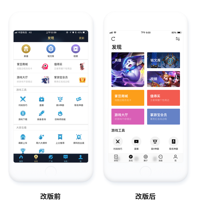 发现页面将之前纯icon的展示方式做了层级区分展示,增大更重要的入口面积,可搭配符合游戏内容的背景图片,这样可以保证通用性排版的同时,增加场景感。相对次要入口采用纯色背景色加文字的方式,入口面积也比之前有所增加,而功能入口则采用icon加原型背景的方式,icon统一为黑色,背景色会根据不同模块采用不同的背景色,颜色以冷色调为主。用视觉的重量层级来表达入口重要度,减少线条分隔,以间距的方式区分模块,会让界面既有层次感,同时也保持界面的简洁。