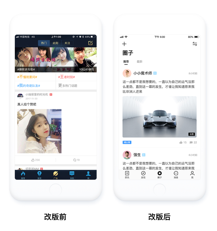 圈子页面的信息流,我们反复尝试,重新排版了信息元素,让页面的图文排版更均衡、清晰,图文以及视频都以16 : 9的比例,让图片和视频都可以达到最佳显示效果,使用户阅读浏览体验更好。