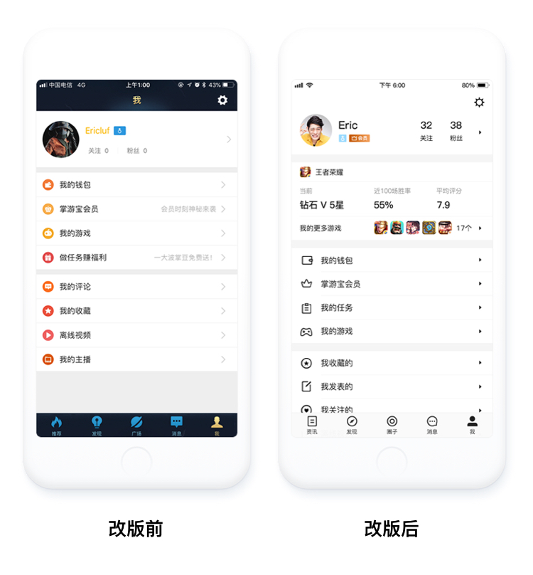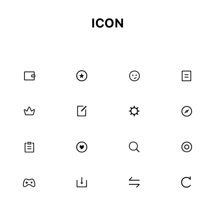 我页面重绘了icon,以单色线性icon主体来直接表达,使icon主体更大,更易识别,且保持整个界面的黑白风格。增加游戏数据模块,使用户关注的信息更扁平。