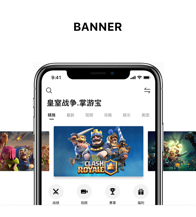Banner图片大小采用16 : 9的固定比例,可以适配视频尺寸,减少编辑的工作量,当前Banner如果是视频,会自动播放短视频。Banner采用轮滑的方式展示,当前Banner有一个放大浮起的效果,增强用户的操作感。