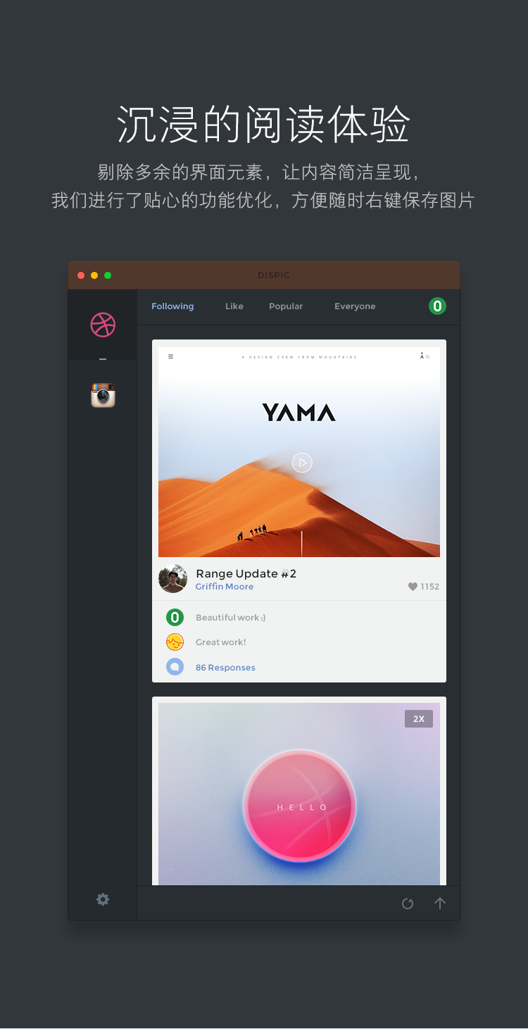 DISPIC 是一款面向设计师的精选内容源的图片类阅读工具,你可以在 Mac 上轻松的融合 Instagram 和 Dribbble 等多个优质图片平台。Dispic 是 DOT 团队成员内部发起的项目,已于2015年上架 Mac App Store。